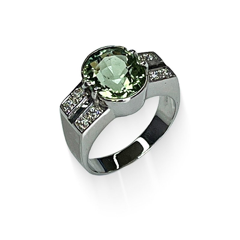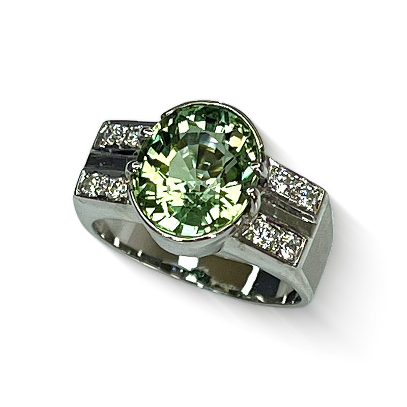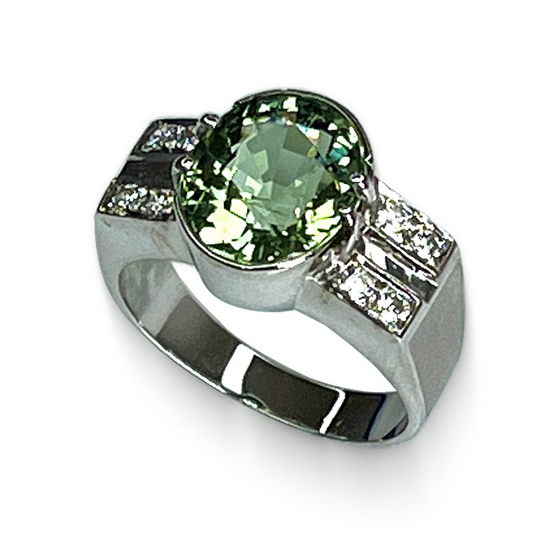 18K White Gold Ring — Natural Green Tourmaline 3.15 ct & Diamonds