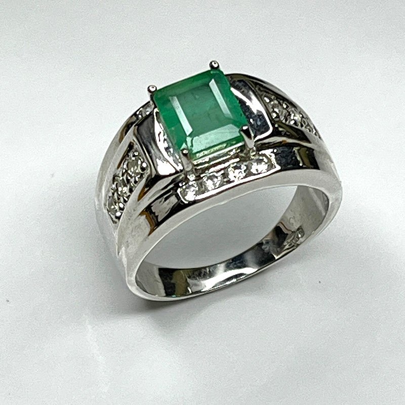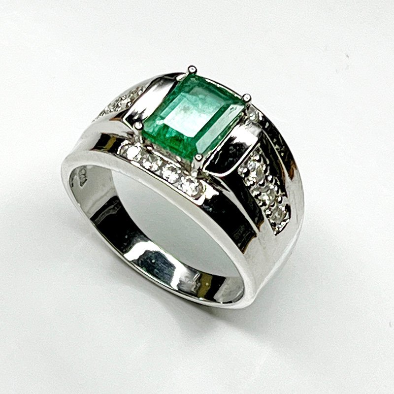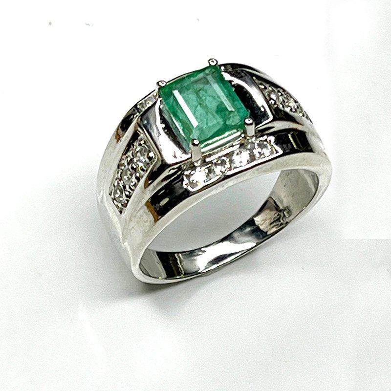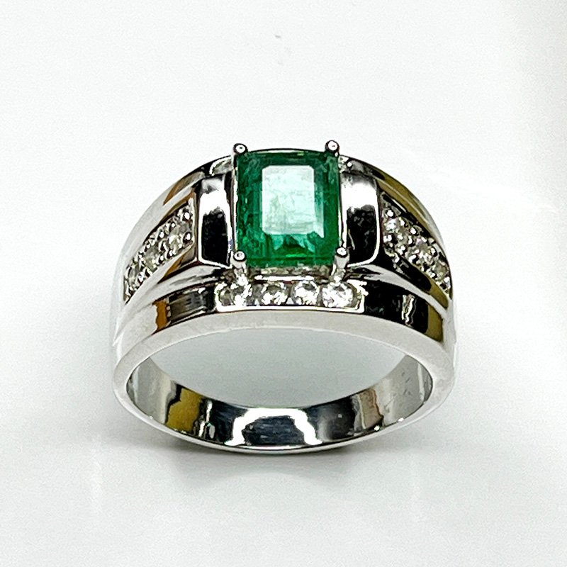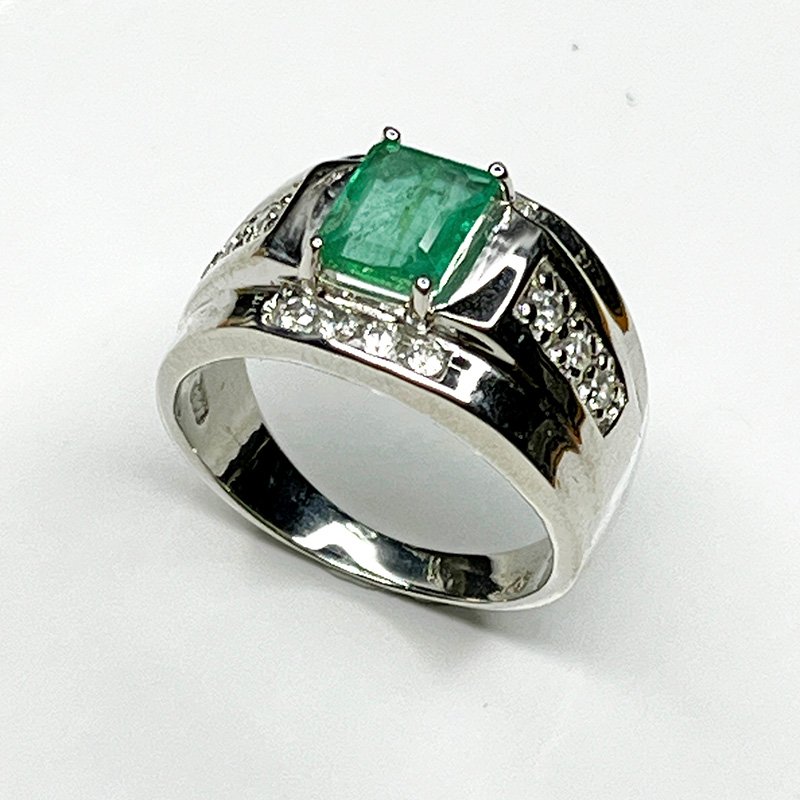 Une bague argent 925 de caractère, sublimée par une émeraude naturelle rectangulaire et des pierres d’accent brillantes. Un modèle joaillerie classique, symbole de prestige et de raffinement.