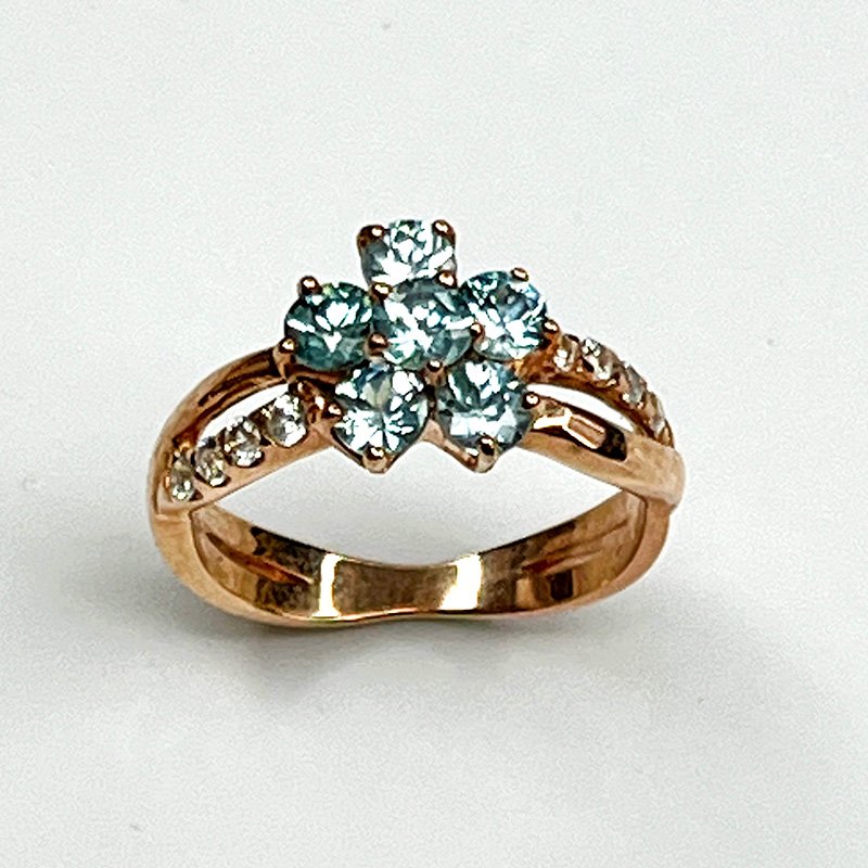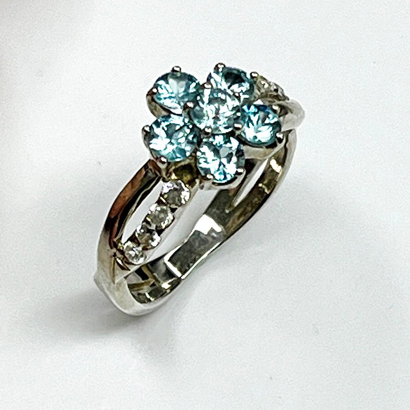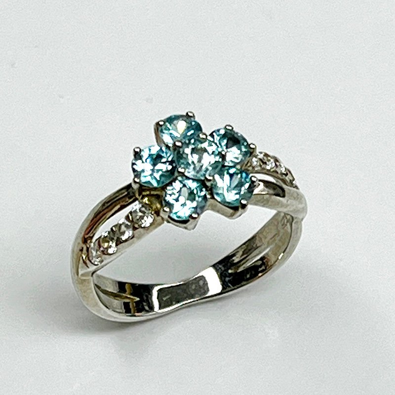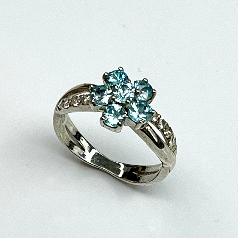 Sa monture en argent massif est sublimée par six zircons bleus taille brillant rond, formant une fleur éclatante,