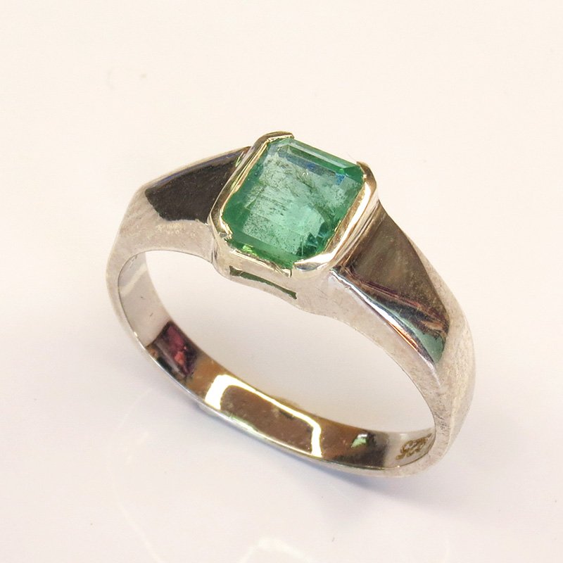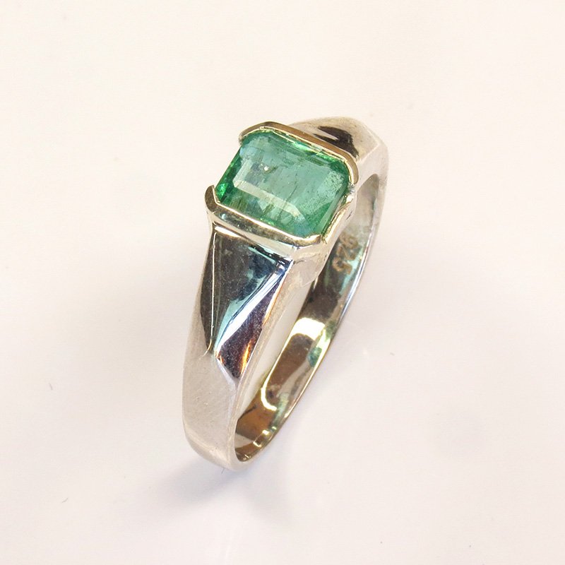 Bague chevalière en argent sterling 925 sertie d’une émeraude naturelle rectangulaire. Modèle Aurora, taille 61, pièce unique.
