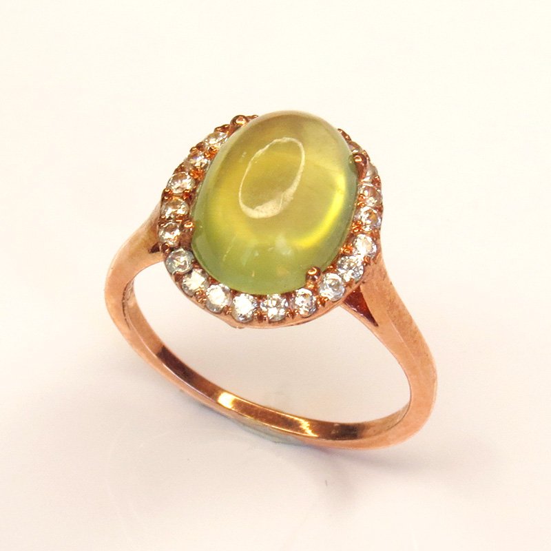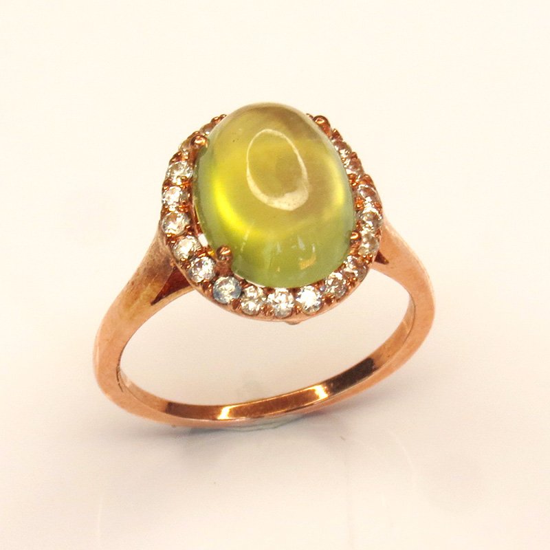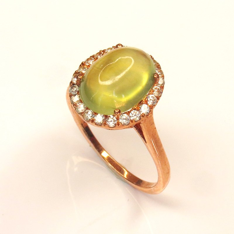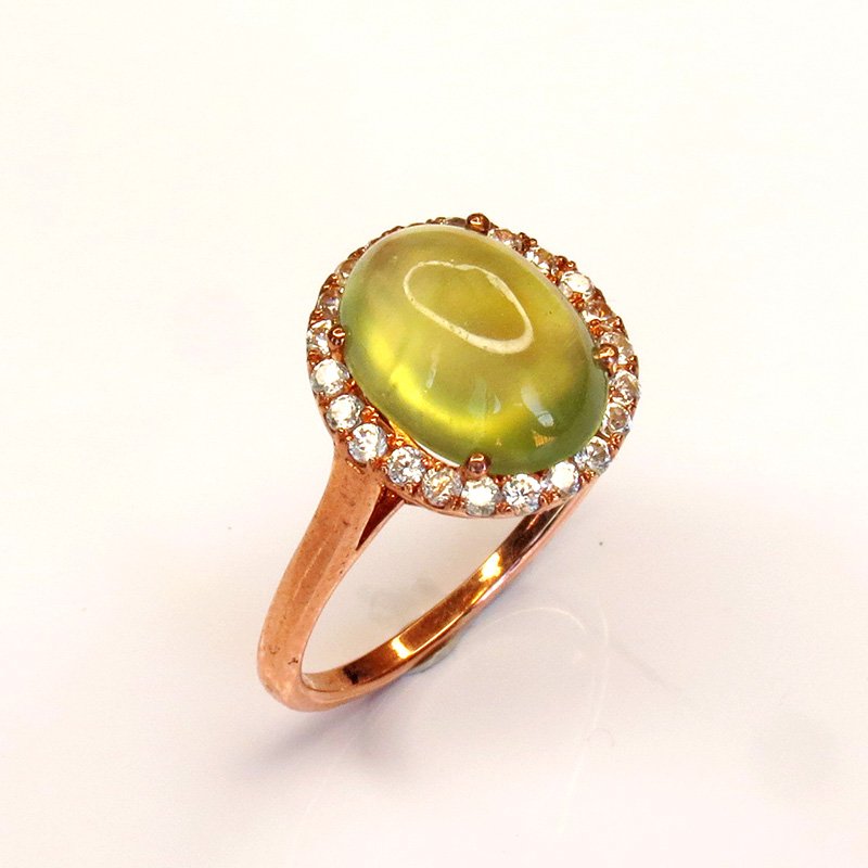 Bague Jardin de Brume en argent 925 plaqué or rose, sertie d’une phrénite naturelle cabochon et d’un halo de zircons blancs. Taille 53. Expédition depuis la Thaïlande.