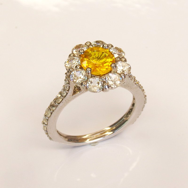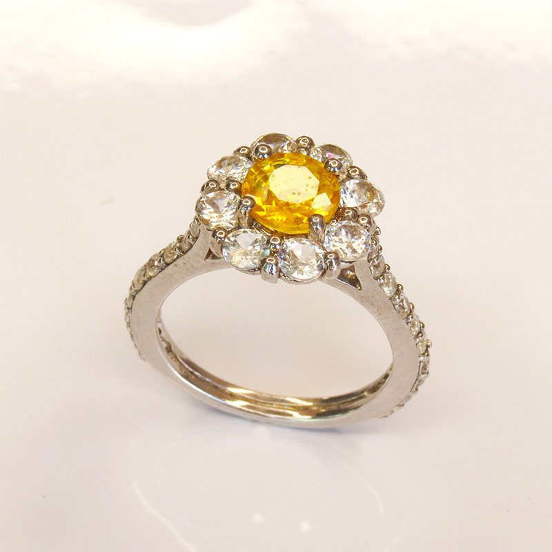 saphir jaune taille ronde, sublimé par un halo de zircons blancs.