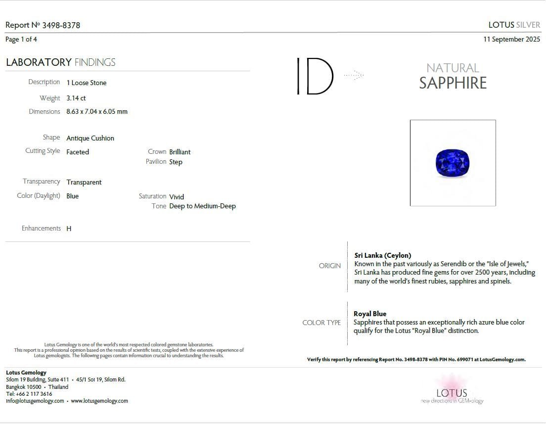 This exceptional Royal Blue Ceylon Sapphire 3.14 ct is graded Royal Blue by Lotus Gemology and originates from Sri Lanka (Ceylon).